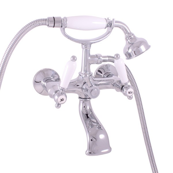 Vodovodná batéria vaňová nástenná s vidlicou na odkladanie sprchy a so sprchou.