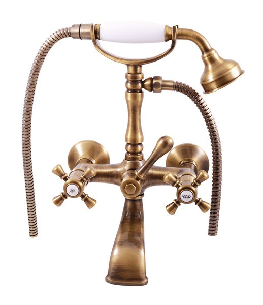 Vodovodná batéria vaňová nástenná s vidlicou na odkladanie sprchy a sprchou.