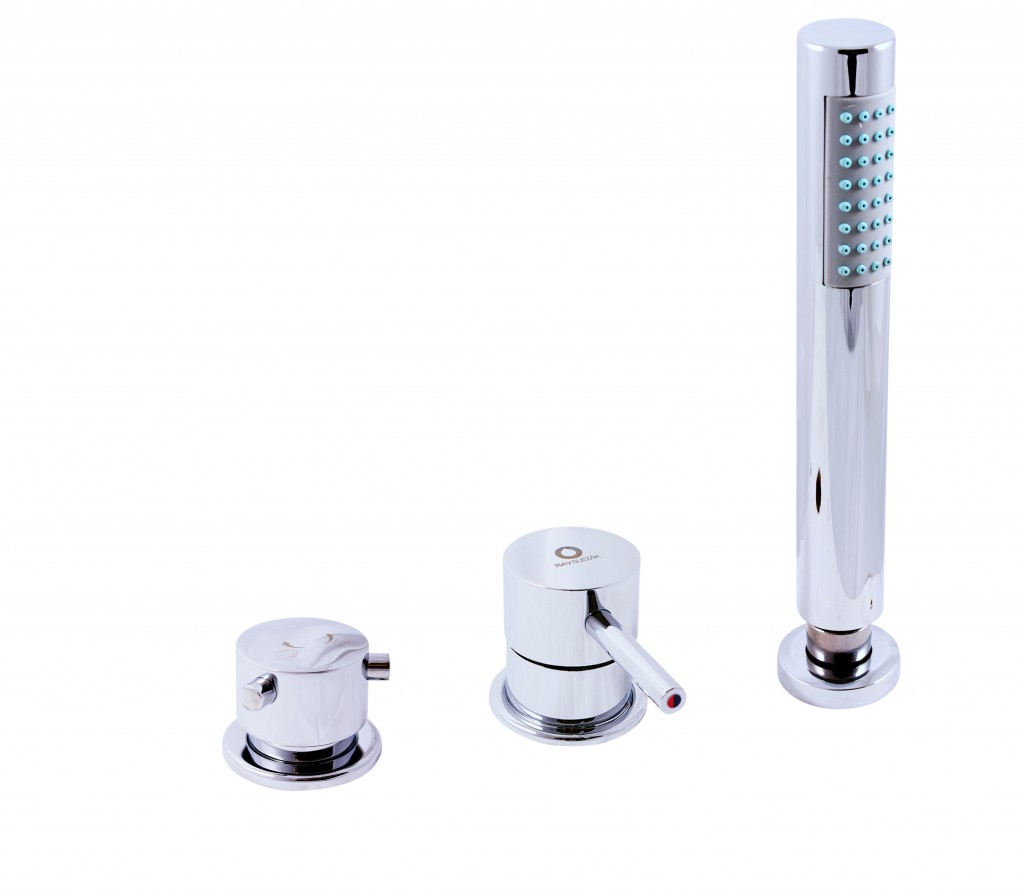 Vodovodné batérie vaňová stojanková trojotvorová s keramickým prepínačom, samonavíjacie 2m hadicou a sprchou, pre napúšťanie cez prepad sifónu.
