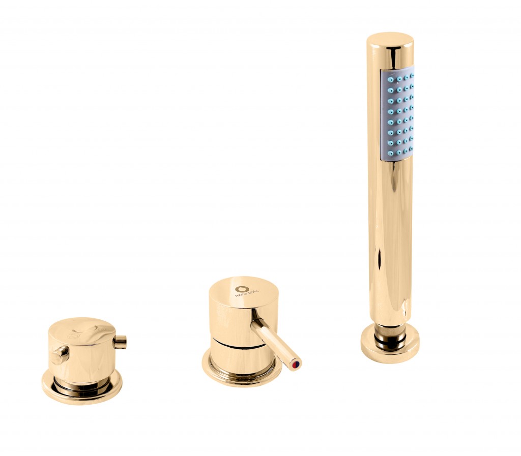 Vodovodné batérie vaňová stojanková trojotvorová s keramickým prepínačom, samonavíjacie 2m hadicou a sprchou, pre napúšťanie cez prepad sifónu.