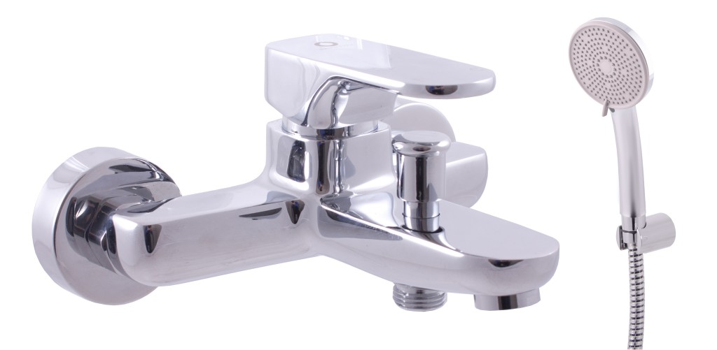 Vodovodná batéria vaňová nástenná so sprchou a pevným držiakom.