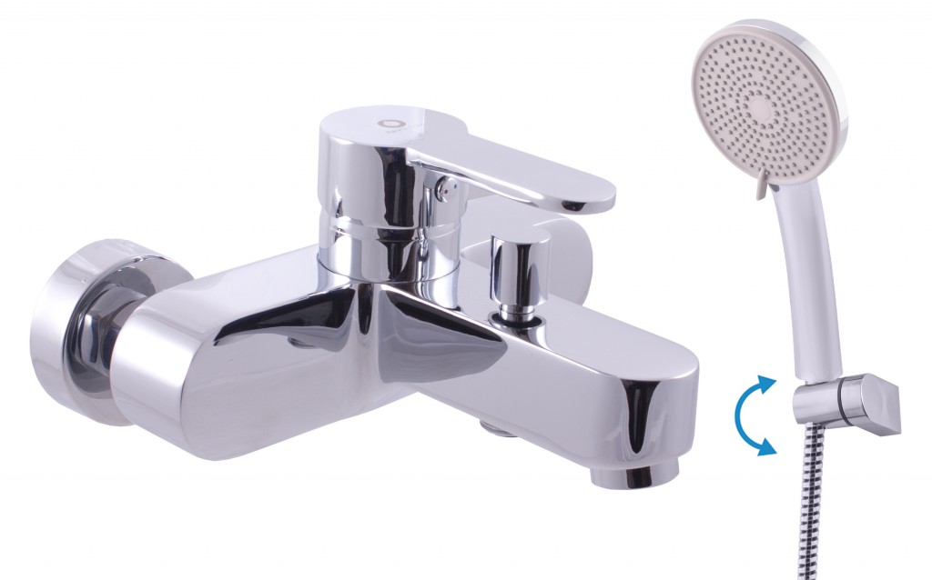 Vodovodná batéria vaňová nástenná so sprchou a otočným držiakom.