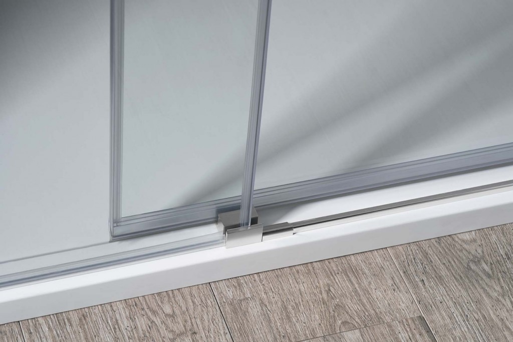 - Sklo dverí je voľne zavesené bez spodného vodiaceho profilu