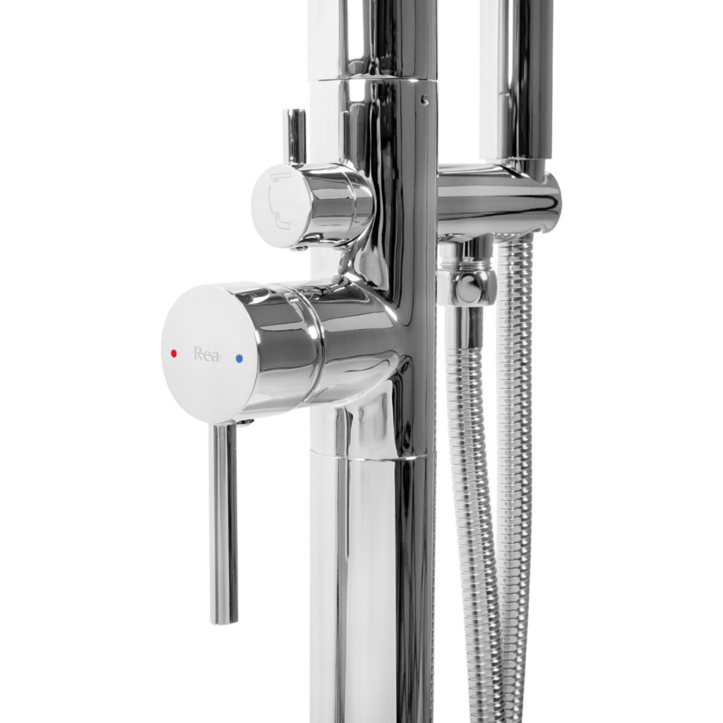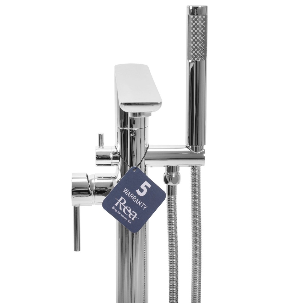 Moderná a veľmi dizajnová voľne stojaca vaňová batéria zaujme svojim neobvyklým dizajnom. Skvele vyplní priestor kúpeľne. Výrobok je vyrobený z vysoko kvalitnej mosadze v zlatom prevedení. Batéria je veľmi odolná a ľahko sa čistí. Voľne stojace vaňové batérie sú moderným a elegantným variantom umiestnenia vodovodných batérií do každej kúpeľne. Je zaujímavou alternatívou k batériám, určeným na stene či vane. Skvele sa hodí do väčších kúpeľní, kde plní nielen čisto funkčnú, ale aj dekoratívnu rolu. V kombinácii s krásnou vaňou spoločne krásne ladia a vytvárajú dokonalý vizuálny efekt. Keramické kartuše zaručujú dlhú životnosť, sprchová hlavica je vybavená systémom Anti-Calc na zamedzenie usadzovania vodného kameňa. Montážny návod