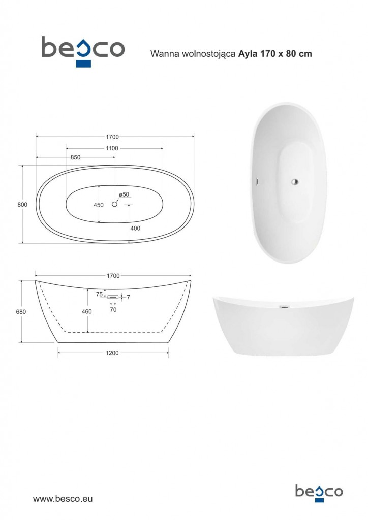 Rozmer voľne stojacej vane:- 170 × 80 cm, objem 250 l