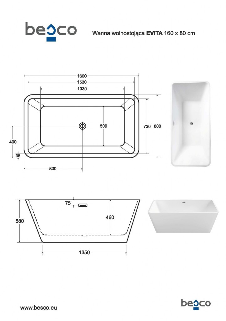 Rozmer voľne stojacej vane:- 160 × 80 cm, objem 230 l