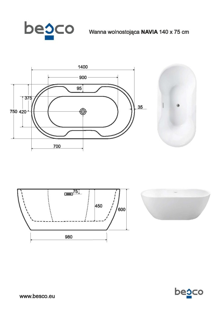 Rozmer voľne stojacej vane:- 140 × 75 cm, objem 190 l