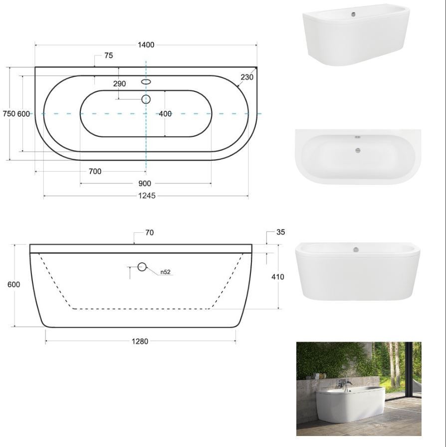 Rozmer voľne stojacej vane:- 140 × 75 cm, objem 155 l