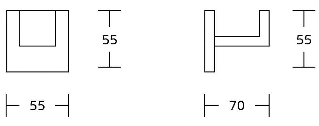 Nástenný háčik uterákov séria VOX je hranatého tvaru a vyrobený z nerezovej ocele . Je určený na inštaláciu vŕtaného spoja. Rozmery: široký 55 mm, vysoký 55 mm a hĺbka od steny je 70 mm.