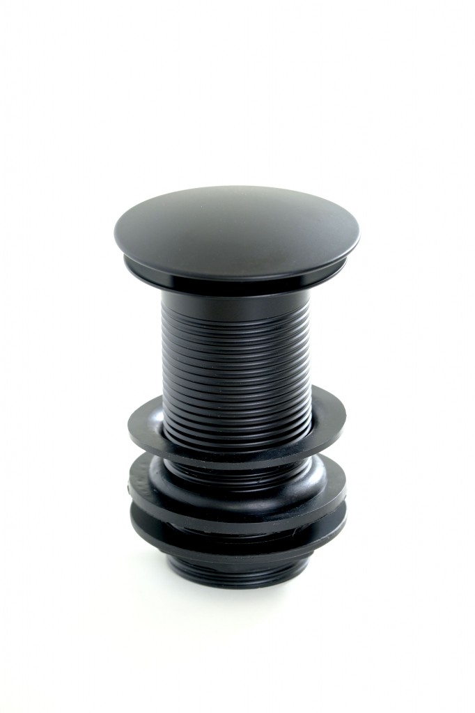 Čierny umývadlový výpust s click-clack systémom pre umývadlá bez prepadu. Výpust má veľkú zátku a je vyrobená z mosadze a zliatiny zinku.
