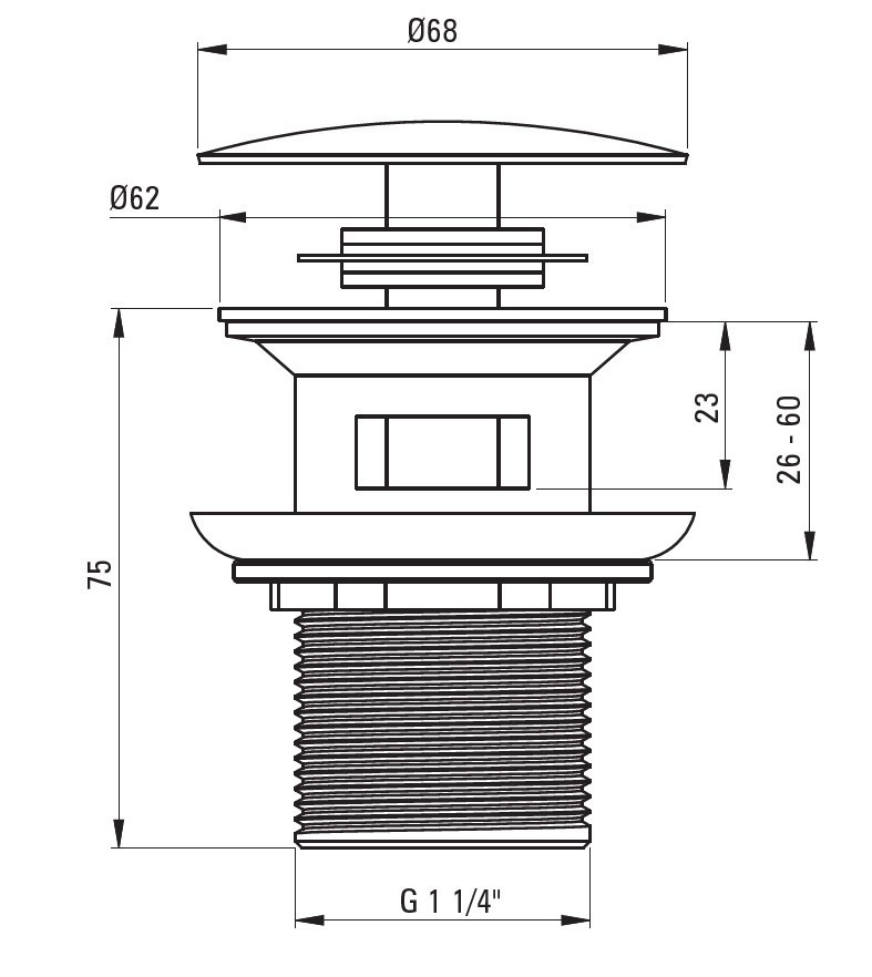 Čierny umývadlový výpust s click-clack systémom pre umývadlá s prepadom . Výpust má veľkú zátku a je vyrobená z mosadze a zliatiny zinku.