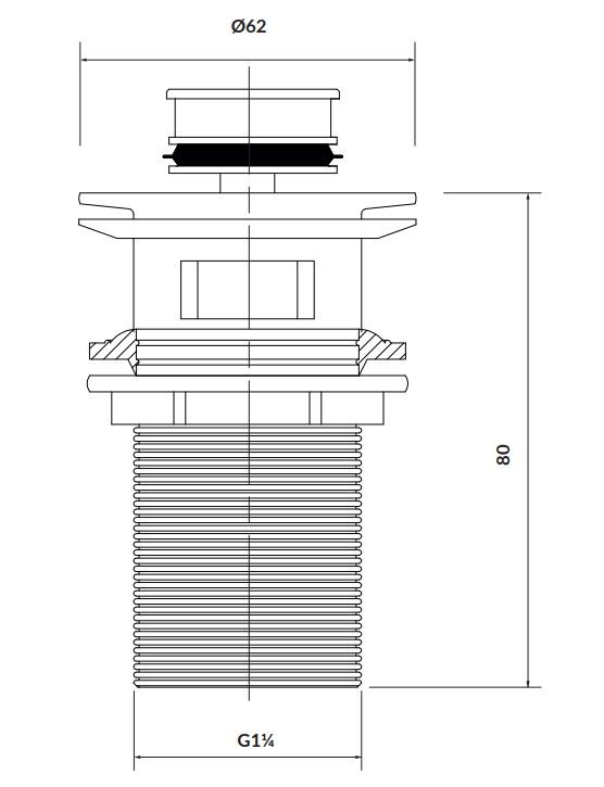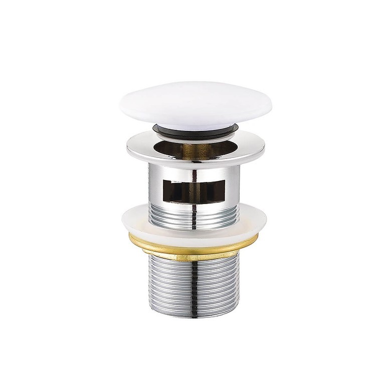 Biela keramická zátka s mechanizmom z odolnej mosadze a silikónovým tesnením. Výpusť je určená do umývadiel s prepadom a keramická zátka dokonale ladí s farbou Euro White keramiky Larga.