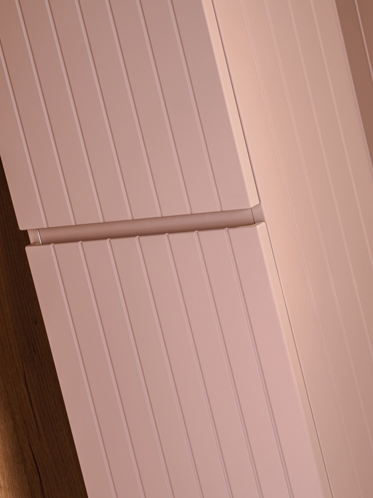Štýlová vysoká skriňa v elegantnom odtieni starovekej ruže prináša do kúpeľne jemný nádych luxusu a originality. Vhodná pre milovníkov nevšedného dizajnu, ktorí hľadajú funkčný aj dekoratívny prvok.