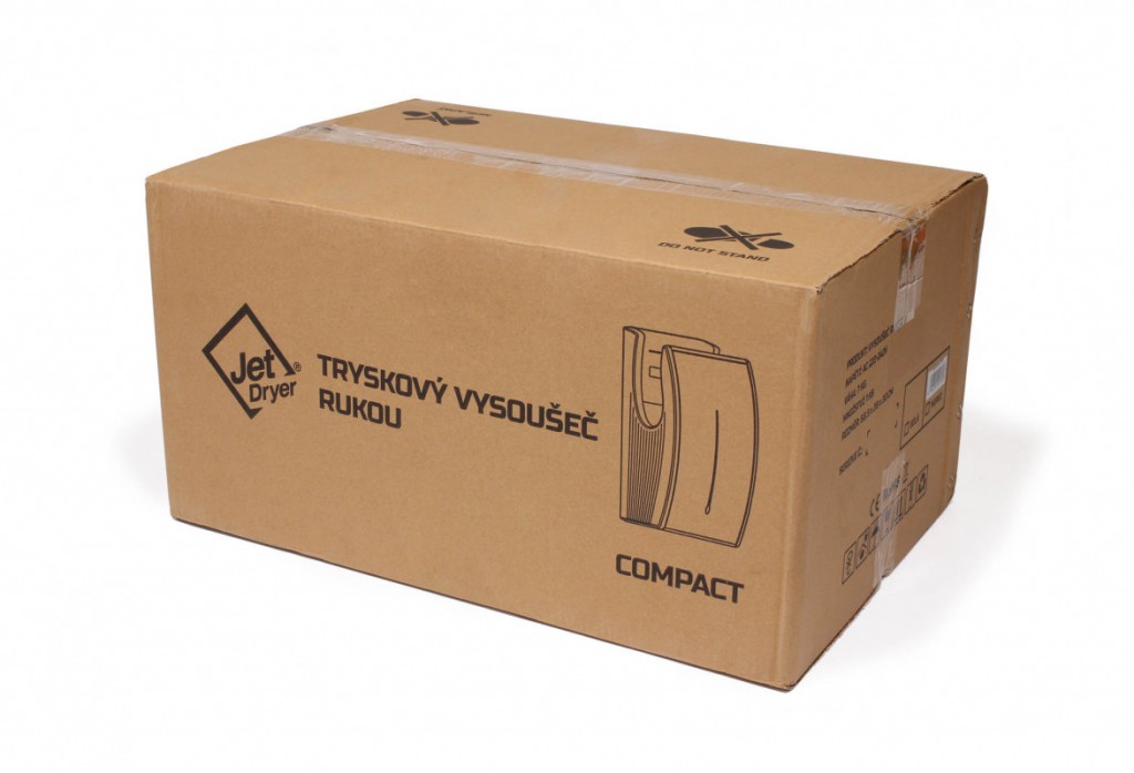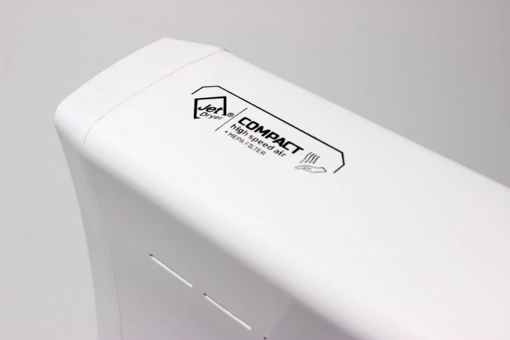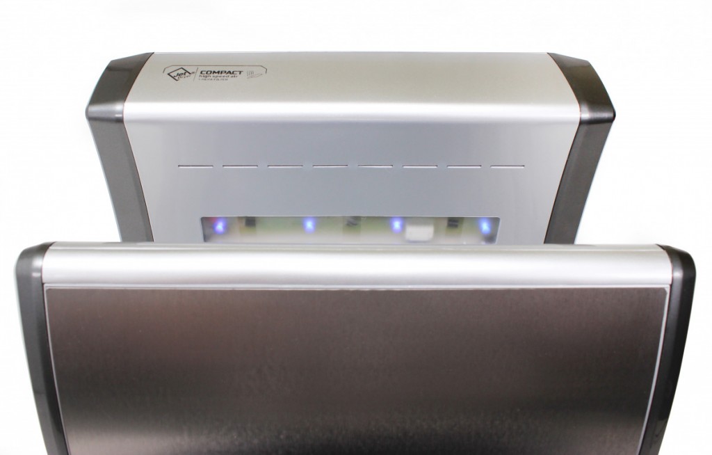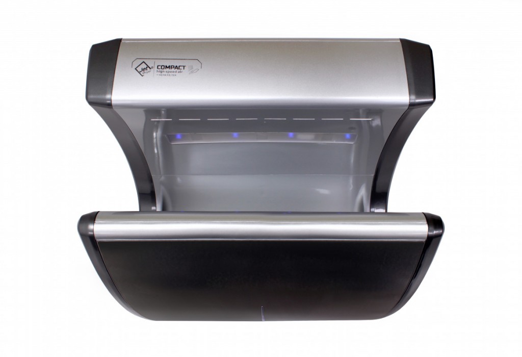 Jet Dryer COMPACT je malý tryskový sušič vhodný predovšetkým do umyvární limitovaných priestorom. V striebornom prevedení je predný panel sušiče z kovu, čo zvyšuje jeho odolnosť vo frekventovaných prevádzkach. Sušič rúk COMPACT je vybavený HEPA filtrom. Voda, ktorá sa pri vysúšanie neodparí, je zachytávaná v odkvapkávacieho nádobke.