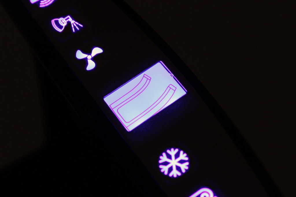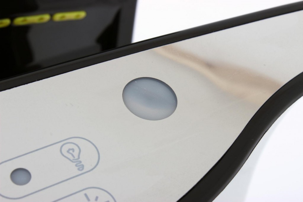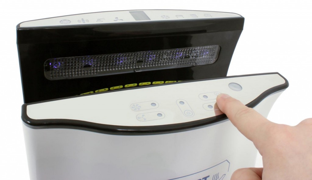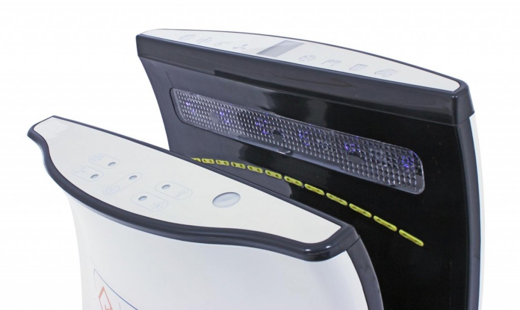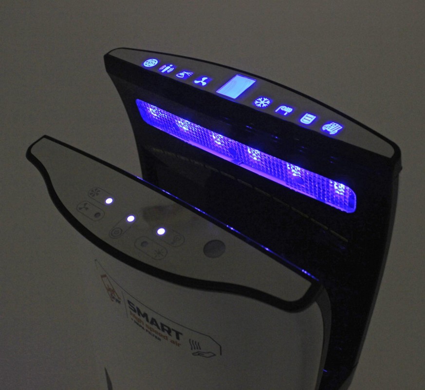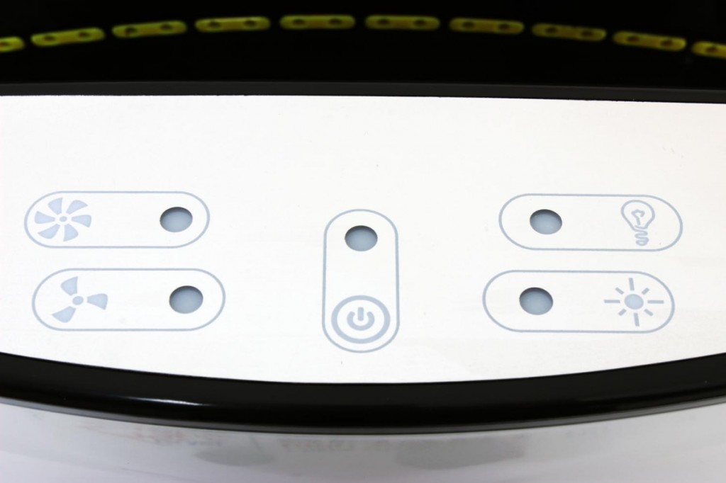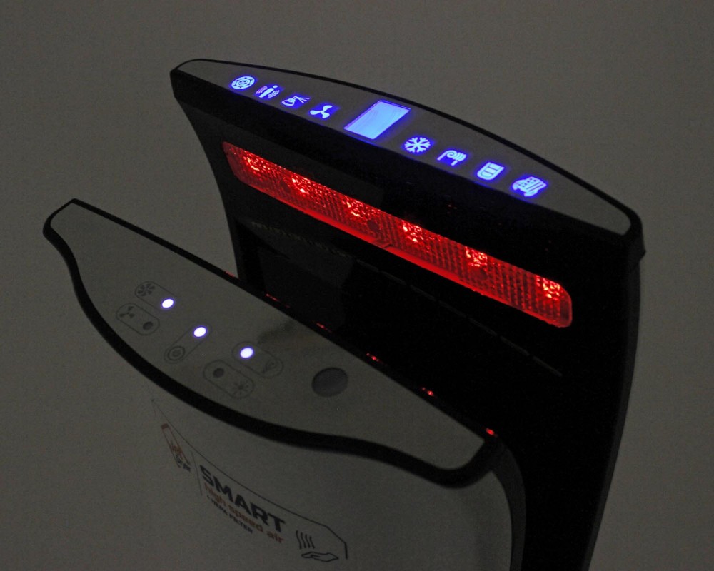 Stredom ovládacieho panelu je spínač uvádzajúca sušič do chodu. Na ľavej strane nájdete dve tlačidlá prepínajúci rýchlosť ventilátora. Na pravej potom prepínanie farebného podsvietenia a ohrevu vzduchu.