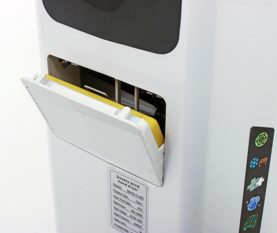 V strede informačného panelu je umiestnený monochromatický displej zobrazujúci správny postup vysúšania rúk.