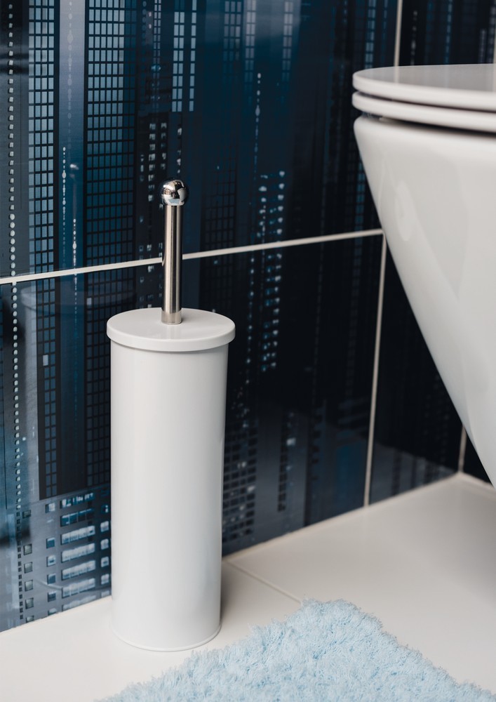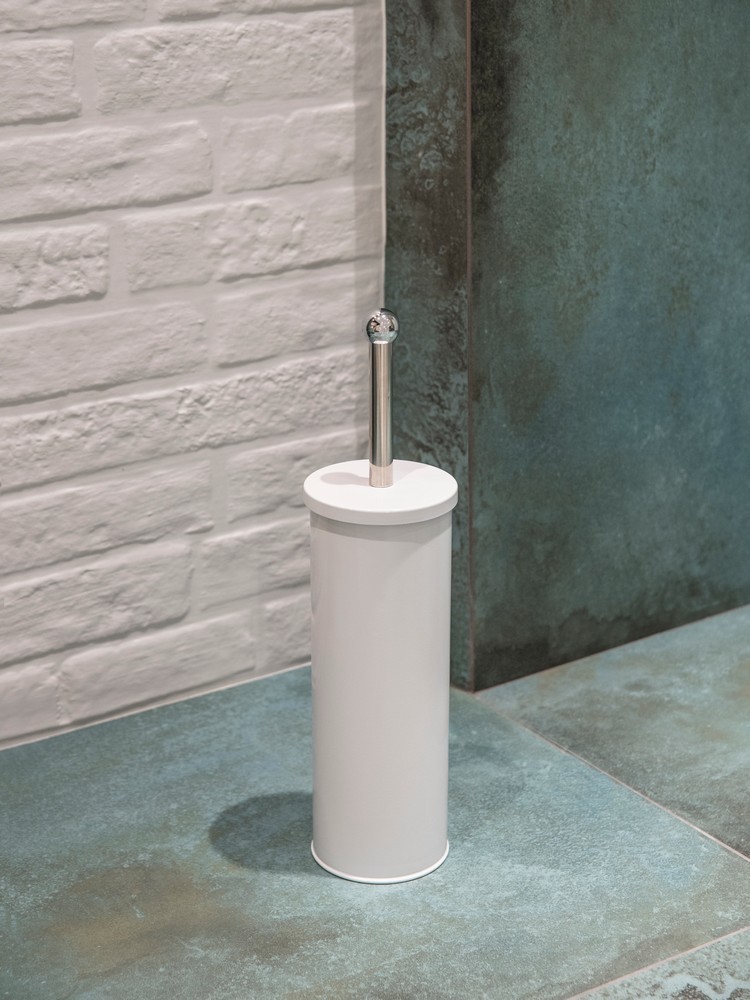 Biela toaletná štetka je vyrobená z práškovo lakovanej ocele. Nádoba a veko štetca sú biele, rukoväť je strieborná.