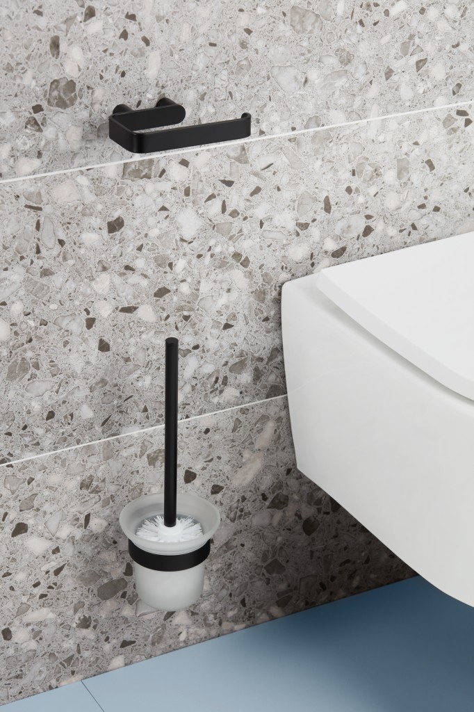 Kovová WC štetka s pohárom z matného skla od výrobcu KFA je určená na inštaláciu vŕtaného spoja.
