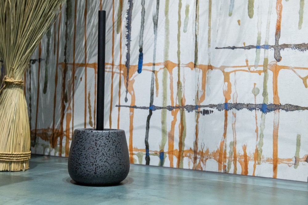 Nádoba na kefu je vyrobená z tmavej, matnej antracitovej kameniny. Má nepravidelné, čierne škvrny, ktoré mu dodávajú neobvyklý vzhľad. Rukoväť WC štetky je vyrobená z ocele lakovanej čiernou matnou farbou, zatiaľ čo čistiaca časť je vyrobená z čierneho plastu. Priemer hlavice kefky je cca. 7,5 cm.