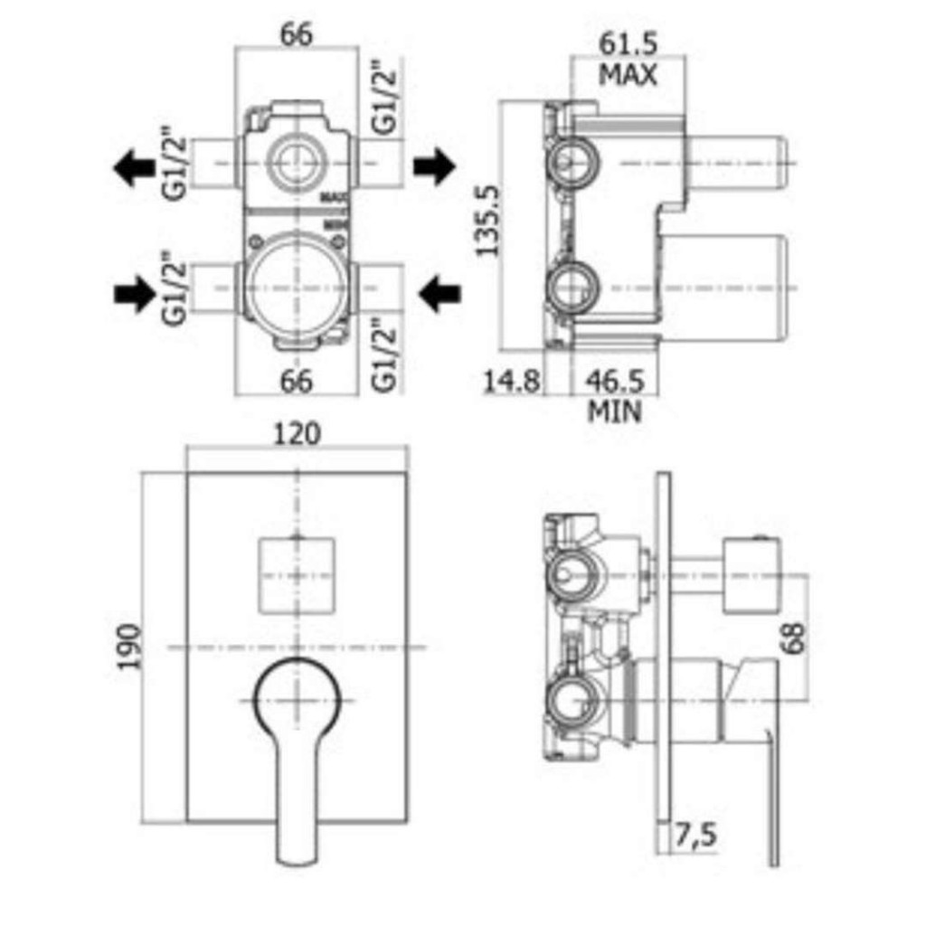 Sprchová páková batéria s otočným prepínačom vrátane podomietkového telesa pre 2 vývody