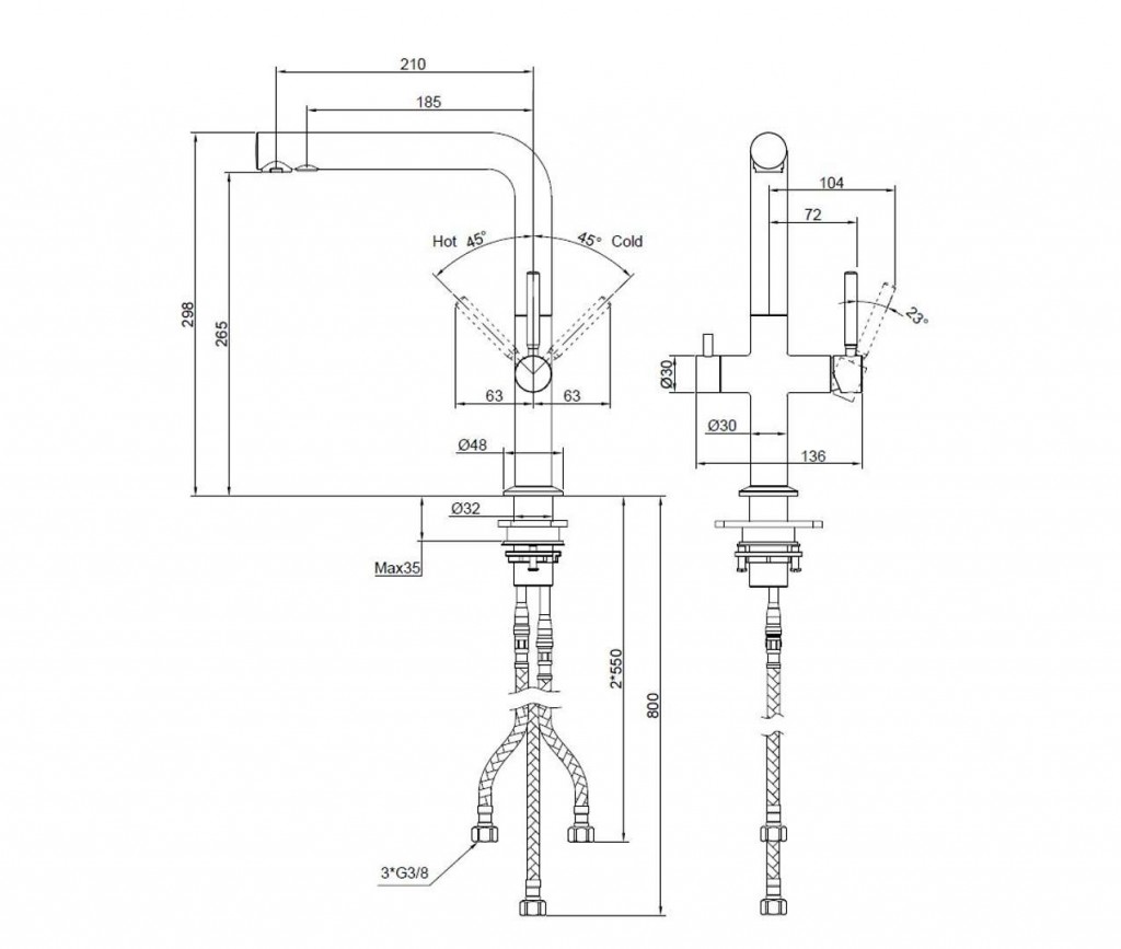 - pružné pripojovacie hadice s dĺžkou 550 mm