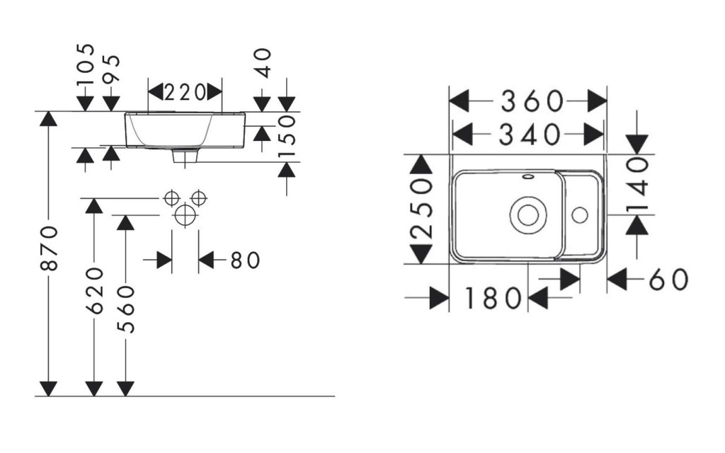 Umývadlo 360/250 s otvorom pre batériu, s prepadom