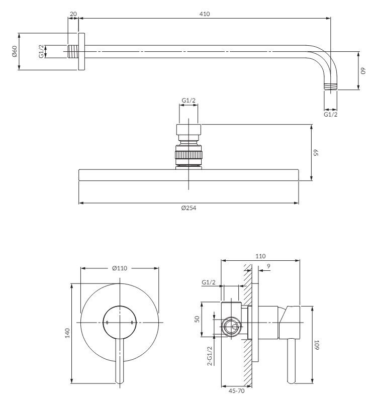 - podomietková sprchová batéria ( Y1245CR ), dva vstupy (pre horúcu a studenú vodu): 1/2", jeden výstup zmiešanej vody: 1/2", s účasťou je zapustený prvok
