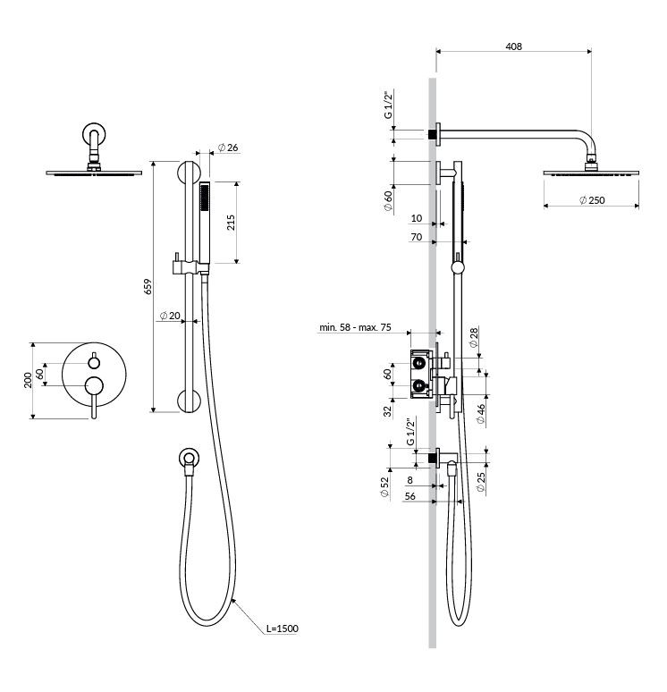 - Dažďová sprcha s ramenom ( WGSET1BSB ), mosadz, rozmer: ø25 cm, dosah od steny: 41 cm