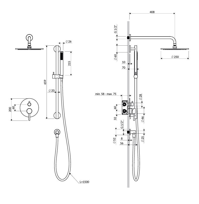 - Dažďová sprcha s ramenom ( WGSET1CP ), mosadz, rozmer: ø25 cm, dosah od steny: 41 cm