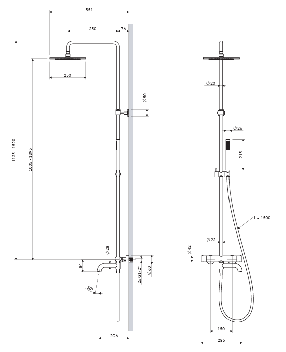 - mosadzná dažďová sprcha, rozmer: ø25cm, dosah od steny: 42 cm