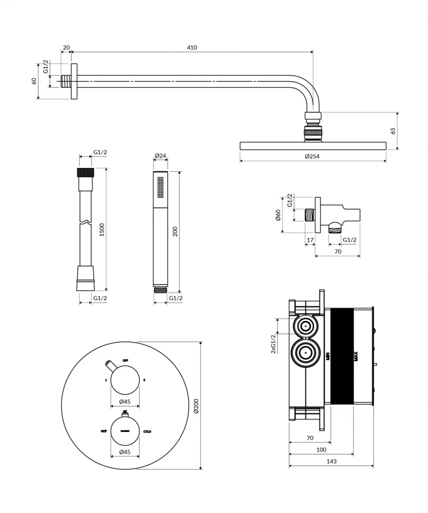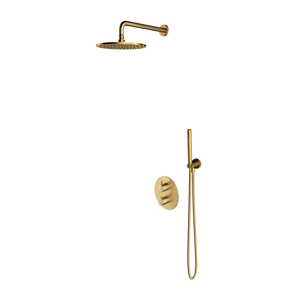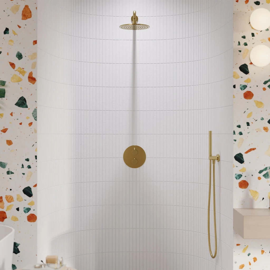 - mosadzná dažďová sprcha s ramenom (WGSET1GLB), rozmer: ø25 cm, dosah od steny: 41 cm