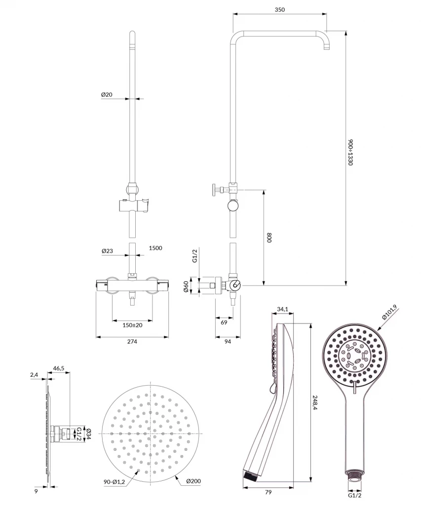 - nerezová dažďová sprcha (WGU120CR), rozmer: ø20 cm, hrúbka na okraji: 0,2 cm, dosah od steny 43 cm