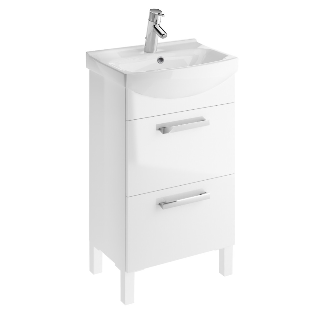 Umývadlo Melara s dvoma šuplíky v bielom lesklom prevedení a chrómovými úchytmi. Možnosť montáže na stenu alebo s nožičkami, ktoré je potrebné doobjednať.