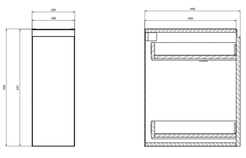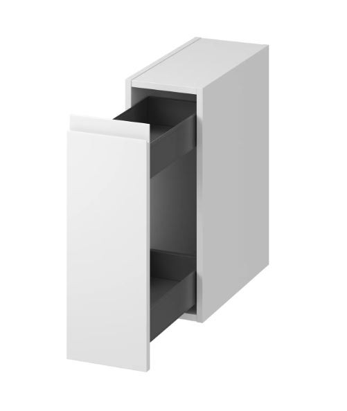 Úzka skrinka po celej dĺžke je ideálna na uloženie vysokých fliaš s tekutinami a ďalších nevyhnutností. Tenké kovové bočnice zásuviek v antracitovej farbe dodávajú elegantný a moderný nádych.