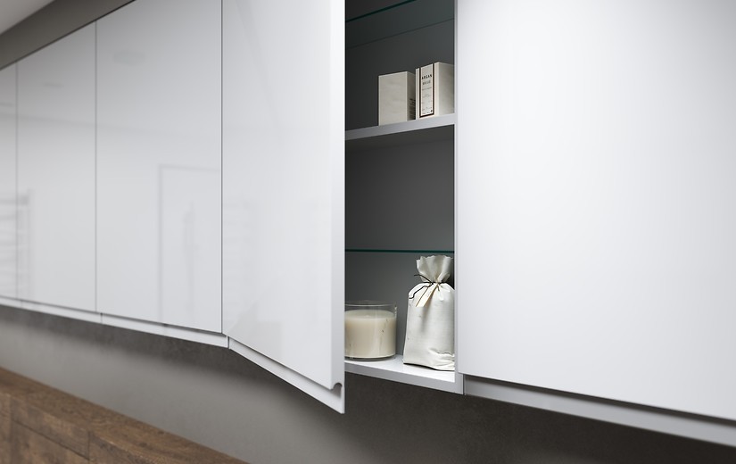 Prídavná horná skrinka MODUO SLIM s univerzálnym otváraním dvierok pravá/ ľavá, je menšia hĺbky než štandardné skrinky a je príkladom moderného kúpeľňového nábytku. Predná časť dvierok so skrytým úchytom a telo skrinky je pokryté lesklým šedým lakom, vnútri sú dve elegantné sklenené police. Dvierka sú vybavené tichým zatváracím systémom.