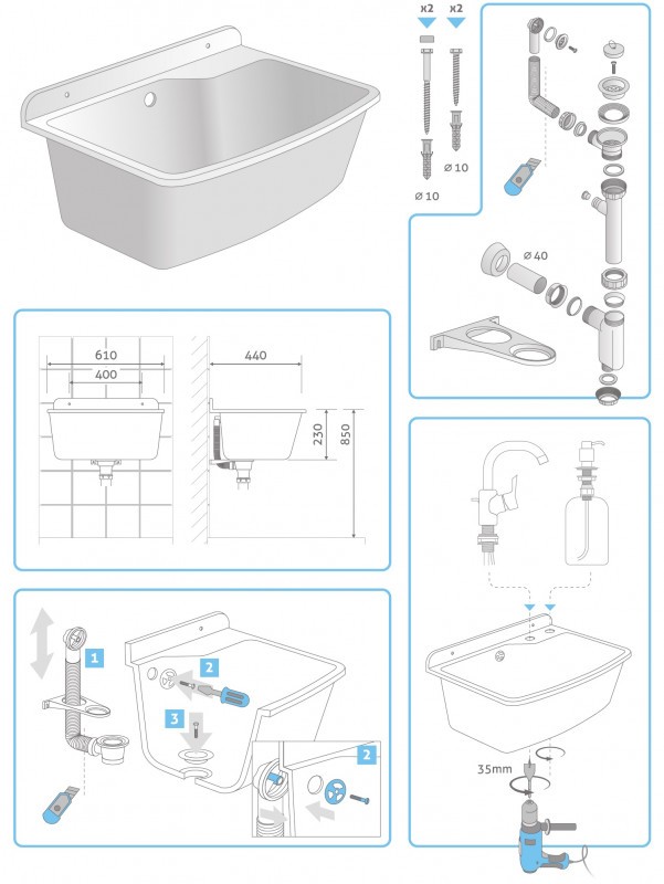 Drez Maximus 610 môže byť montovaný k stene, teda nie je potreba pracovnej desky.Je možné tiež odvŕtaniu otvorov pre batériu a dávkovač saponátu alebo mydla s priemerom 35mm. Súčasťou balenia sú montážne skrutky, sifón, prepad, výpust, zátka a odbočka na umývačku.">