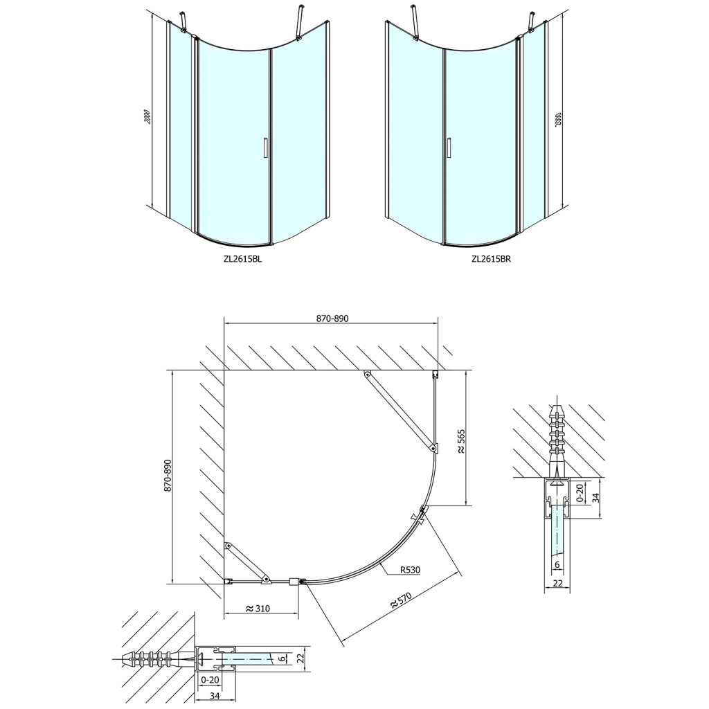 | Tvar | Čtvrtkruhové zástěny |