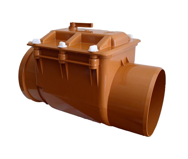 Zpětné klapky DN 110, 125, 160, 200 mm proti zpětnému vzdutí; pro odpadní vody bez fekálií. Dle ČSN EN 13564-1, materiál ABS, PVC-U.