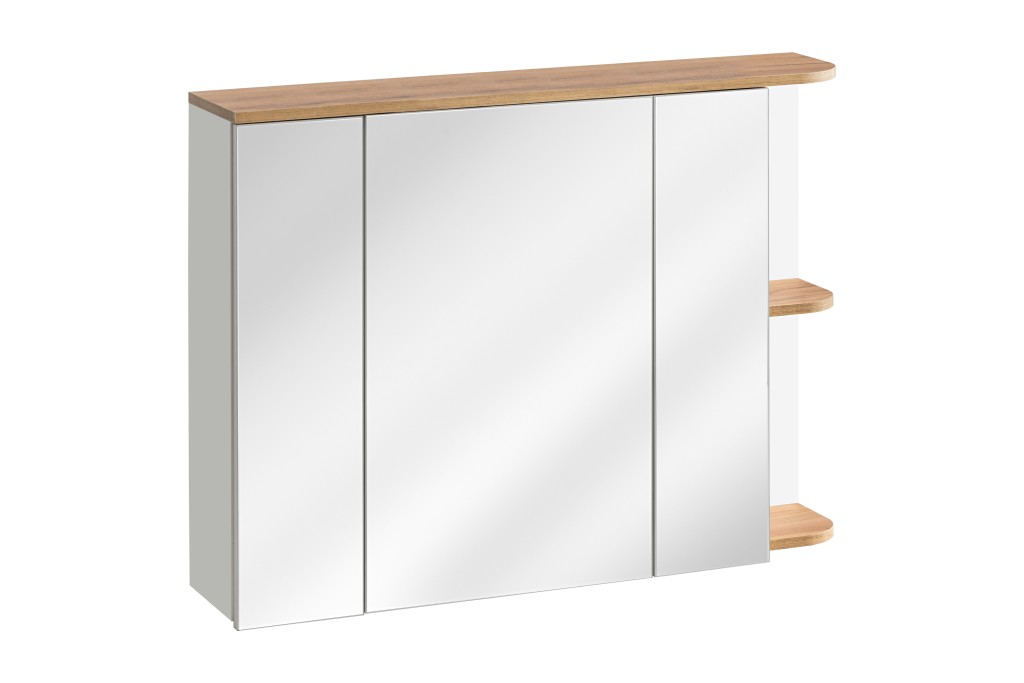 Elegantná zrkadlová skrinka s trojitými dvierkami kombinuje funkčnosť a moderný dizajn. Poskytuje dostatok úložného priestoru na každodenné potreby v kúpeľni. Kombinácia bielej farby a dekoru zlatého duba dodáva skrinke hrejivý, prirodzený vzhľad. Praktické riešenie pre kúpeľne, kde je potrebné spojiť úložný priestor so zrkadlovou plochou.