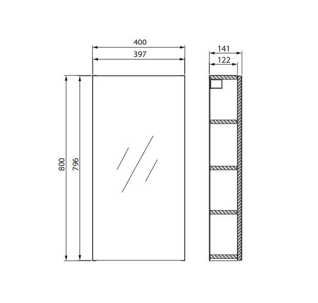 Závesná skrinka so zrkadlovým čelom a 3 policami vo vnútri, ktorá poslúži ako zrkadlo aj ako miesto na uloženie drobnej kozmetiky. Zrkadlová skrinka má bezúchytkový systém otvárania dvierok a tiché „ soft close “. Korpus skrine je vyrobený z laminovanej drevotrieskej dosky .