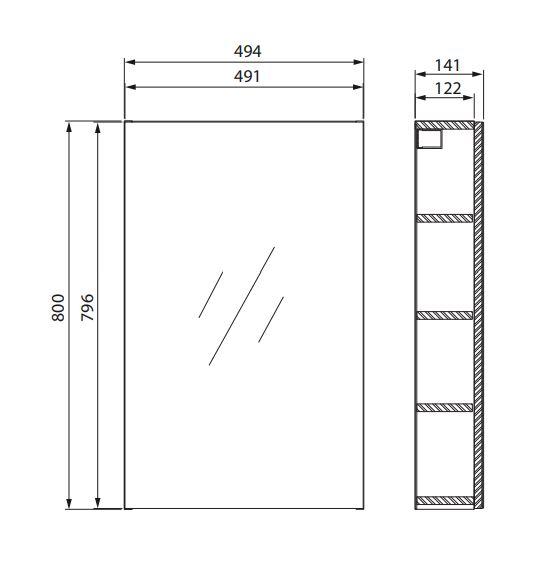 Závesná skrinka sa zrkadlovým čelom a 3 policami vo vnútri, ktorá poslúži ako zrkadlo aj ako miesto na uloženie drobnej kozmetiky. Zrkadlová skrinka má bezúchytkový systém otvárania dvierok a tiché „ soft close “. Korpus skrine je vyrobený z laminované drevotrieskoké dosky .