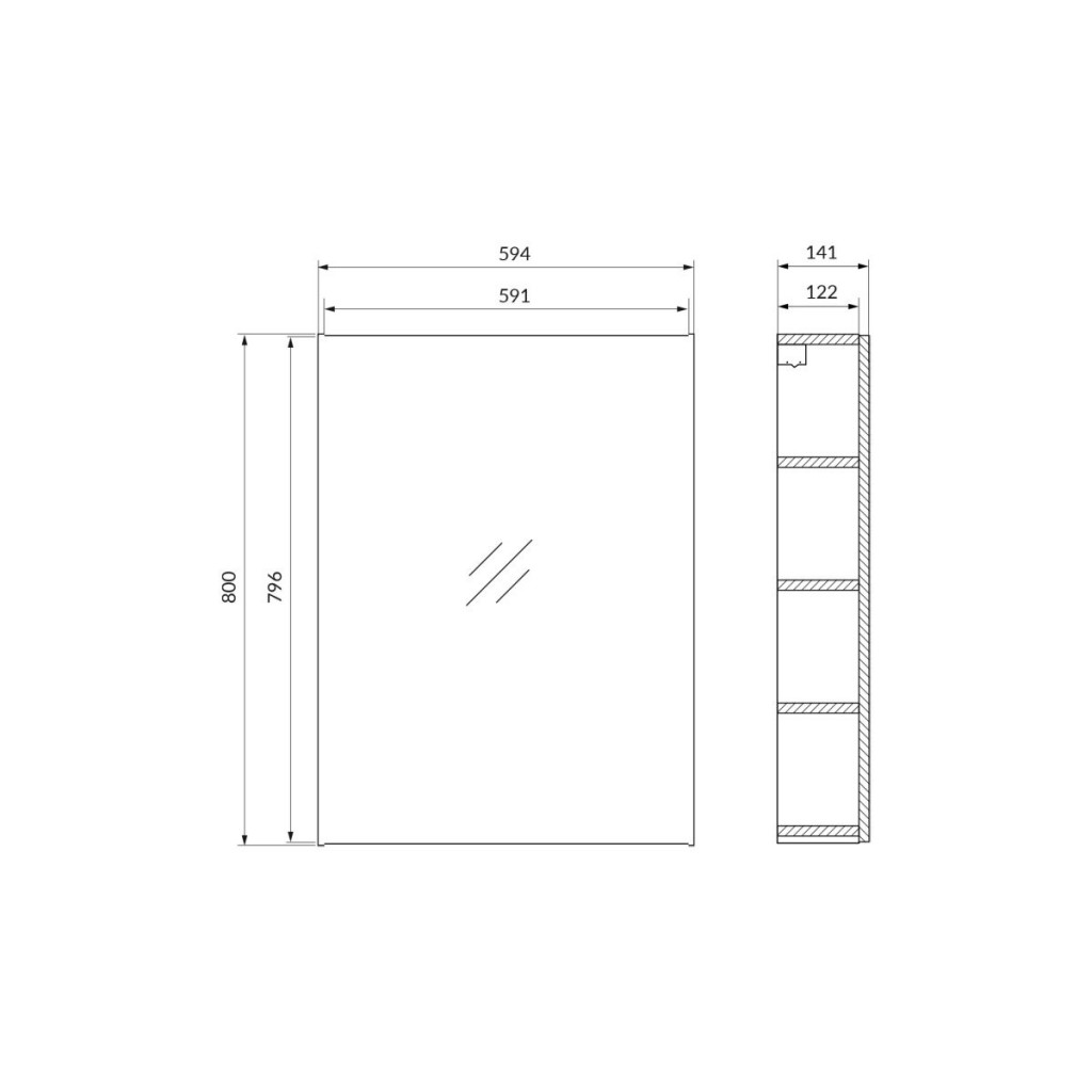 Závesná skrinka so zrkadlovým čelom a 3 policami vo vnútri, ktorá poslúži ako zrkadlo aj ako miesto na uloženie drobnej kozmetiky. Skriňa má bezúchytkový systém otvárania dvierok a tiché „ soft close “. Korpus skrine je vyrobený z laminovanej drevotriesky.