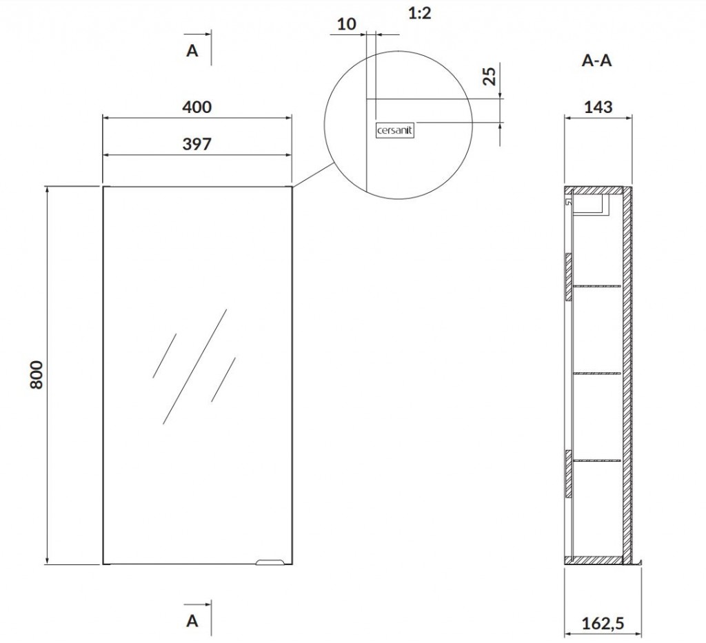 Horná zrkadlová skrinka z laminovanej drevotrieskovej dosky a so striebornou úchytkou. Vnútri sú 3 sklenené police a pánty sú s mäkkým dovieraním. Drevotriesková doska použitá v skrini má certifikát FSC MIX CREDIT SGSCH-COC-007574.