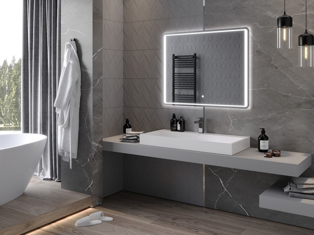 Moderné a jednoduché zrkadlo kolekcie ZUSA je vybavené LED podsvietením, ktoré sa ľahko ovláda pomocou dotykového tlačidla priamo na ploche zrkadla . Zrkadlo je vybavené vyhrievacou podložkou ANTI-CAR , ktorá eliminuje zahmlenie skla.