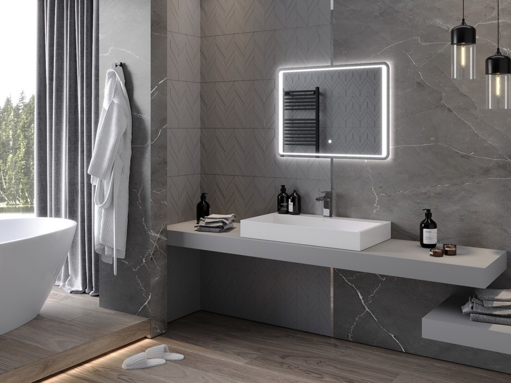 Moderné a jednoduché zrkadlo kolekcie ZUSA je vybavené LED podsvietením, ktoré sa ľahko ovláda pomocou dotykového tlačidla priamo na ploche zrkadla . Zrkadlo je vybavené vyhrievacou podložkou ANTI-CAR , ktorá eliminuje zahmlenie skla.